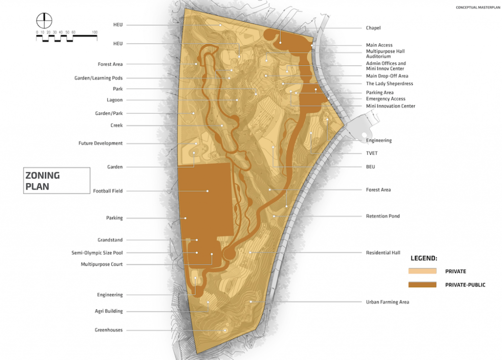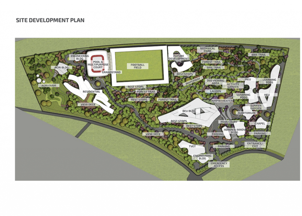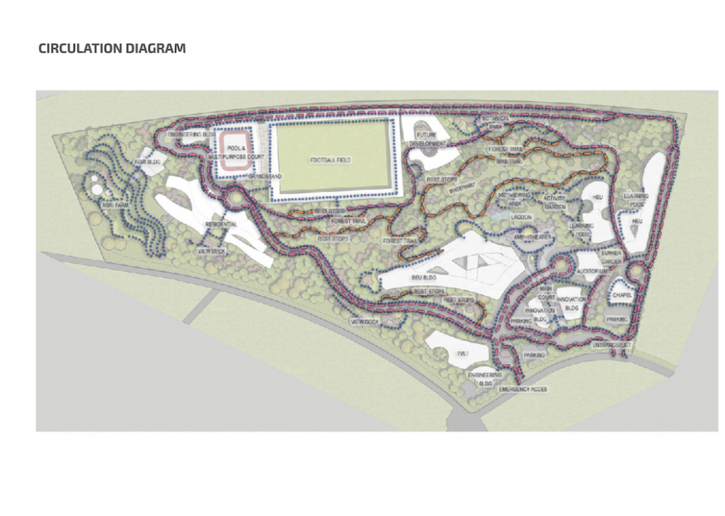 For the landscape architectural design, our overarching missions is to create a pedestrian centered campus thru a network of pathways and bike lanes within the campus – for ease of access to and from bldgs. This helps create a healthy lifestyle. The design aims for the people to gain a deeper appreciation of the natural environment, through the strategic use of diversified flora that includes native species of Pampanga. We want to align with Miriam College’s culture of excellence by creating an experiential learning outdoors that foster collaboration, gatherings. We propose having an outdoor lab that includes a botanical park, urban farm and forest trails.