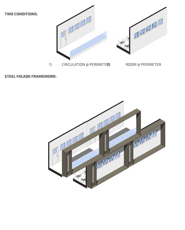 A steel façade framework was developed on which the different façade skins can be attached. This framework also acts as vertical sunscreens, and will ultimately visually organize the different elements of the architecture when they are in place. Commercially available steel grating will be used as a material for the railings to allow wind to pass through.