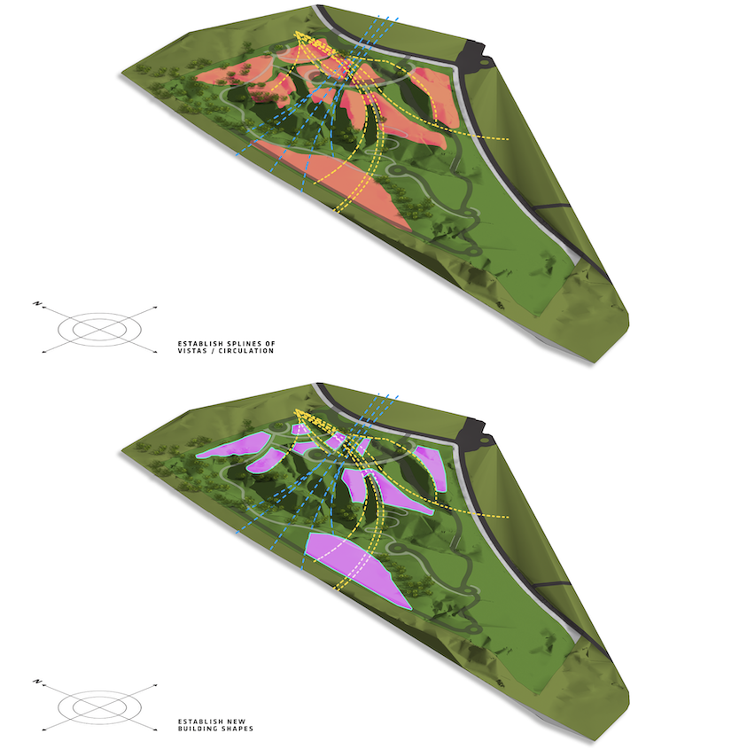 A Series of Axes were laid on throughout the entire site to organise the architecture its inter-relationship with the surrounding spaces within the site. As the site is a very hilly one, filed with slopes and contours rather than flat planes, so the axis used are slightly curved, to react and respect the original topography of the site and also creates a more interesting visual experience as this creates a higher level of curiosity and discovery from within the viewer, rather than a straightforward axis that reveals all design elements from the get go.