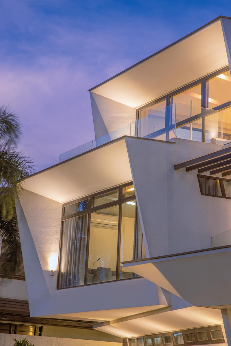 The upper levels are V-shaped in plan, with each wing containing cross-ventilated spaces with shallow depths that facilitate easier air circulation and natural light penetration within. The interstitial space between the wings of the V are designed to be balconies.