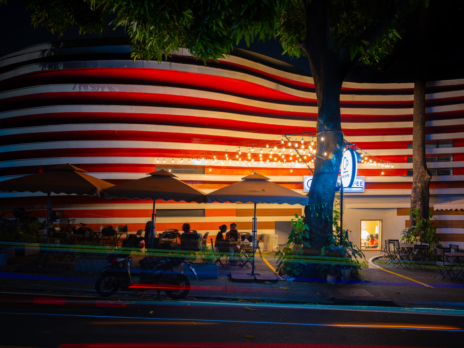 We developed the design further by allowing the identity of the company come out in the architecture. Since Lightscape’s main products are cameras, we latched onto how cameras manipulate light to capture images. And since color is a manifestation of light, the canopies act as canvases that are painted with a gradient spectrum of colors, achieving a very festive and aspirational character identifiable with Filipinos.