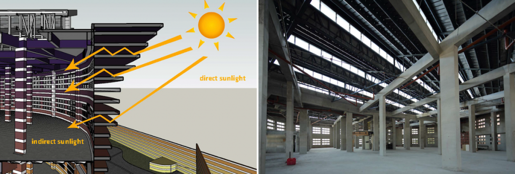 Warehouses, by nature, have deep plans which often result in dark spaces that require artificial lighting to illuminate. Toplighting was brought in as well thru north-facing glass louvers integrated with a saw-tooth roof, allowing light to be ushered in at every 2.7 meters.