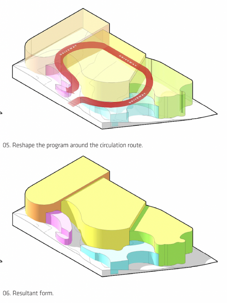 We started with the general massing of the different structures. We first converted the space requirements into cubes and positioned them on site for optimal interflow and function. We then overlaid the cubes with a single, one-way circulation road for the delivery trucks. Efficient and swift transfer of the equipment is the most essential key success factor of the facility, and this single circulatory route (designed with no corners) allow the trucks to drive through smoothly, without needed to slow down while turning.